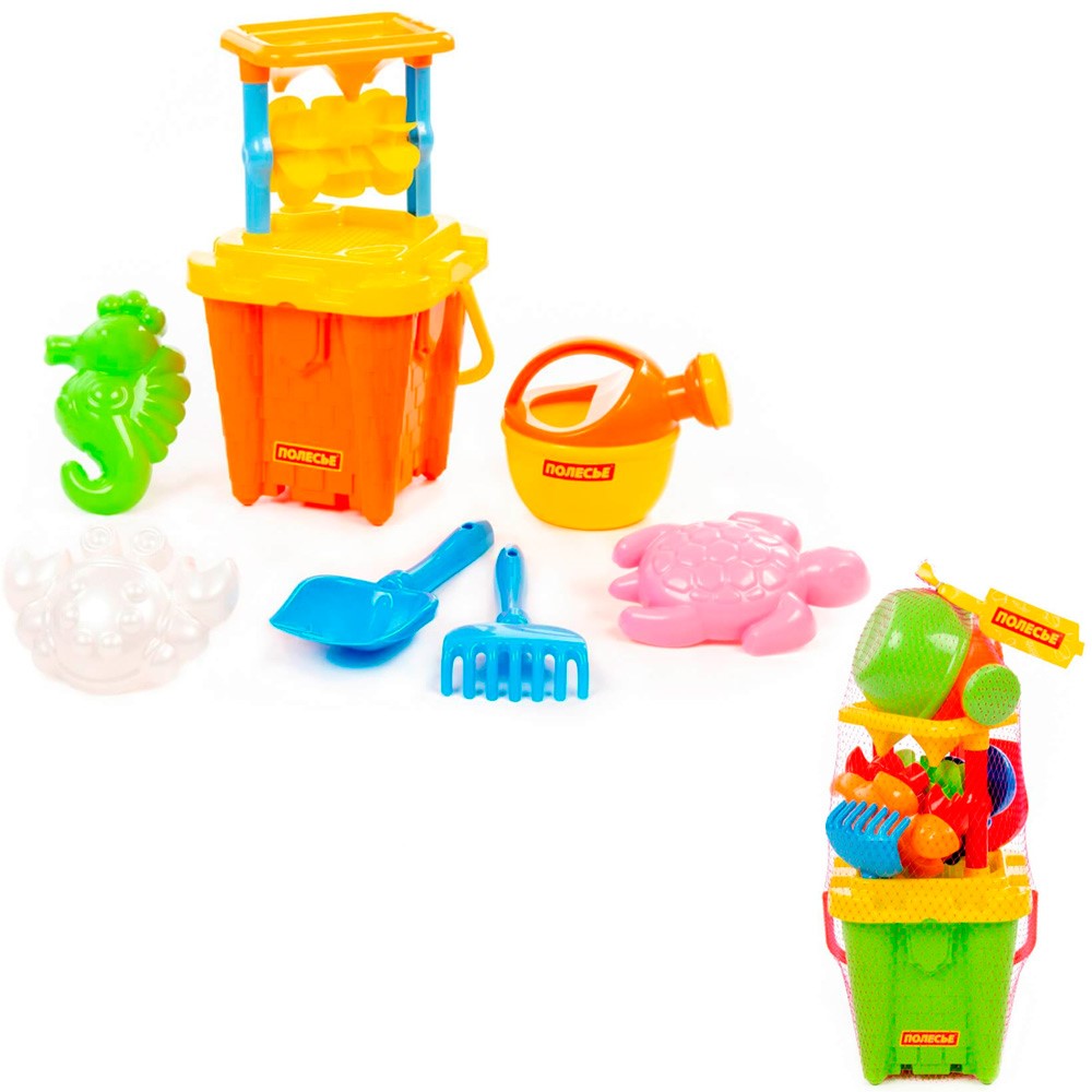 Комплектация: песочная мельница №2 с основанием ситечко-крепость большое №2, ведро-замок большое №2, лопатка №5, грабельки №5, формочки (краб №2 + черепаха + морской конёк), лейка малая №4