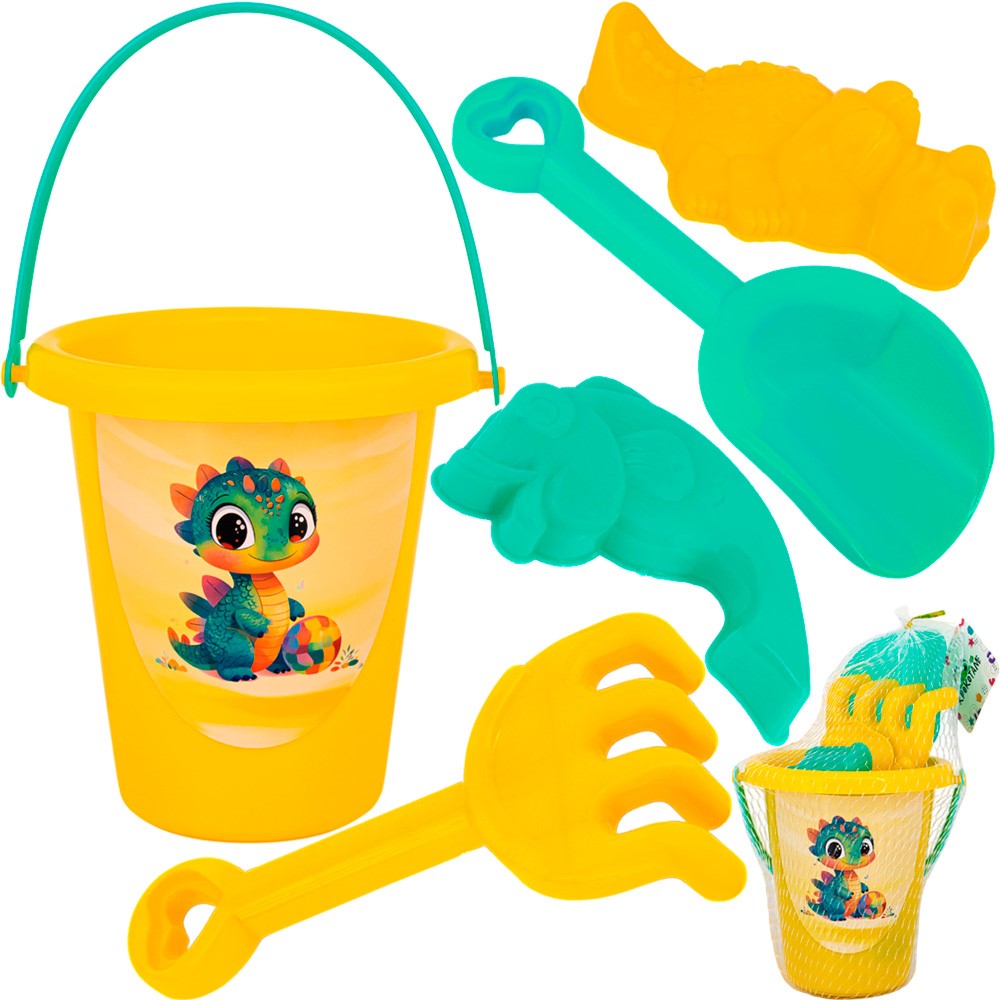Комплектация: ведро - 1 шт, лопатка - 1 шт, грабли - 1 шт, формочки: крокодил - 1 шт, рыбка - 1 шт