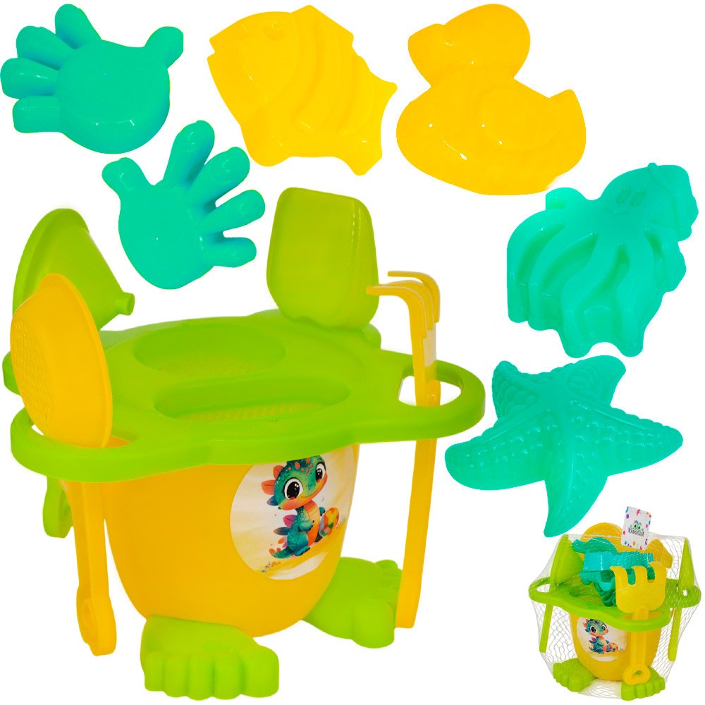 Комплектация: ведро - 1 шт, лопатка - 1 шт, грабли - 1 шт, сито - 1 шт, воронка - 1 шт, формочки: рука - 1 шт, утка - 1 шт, осьминог - 1шт, морская звезда - 1 шт, рыбка - 1 шт
