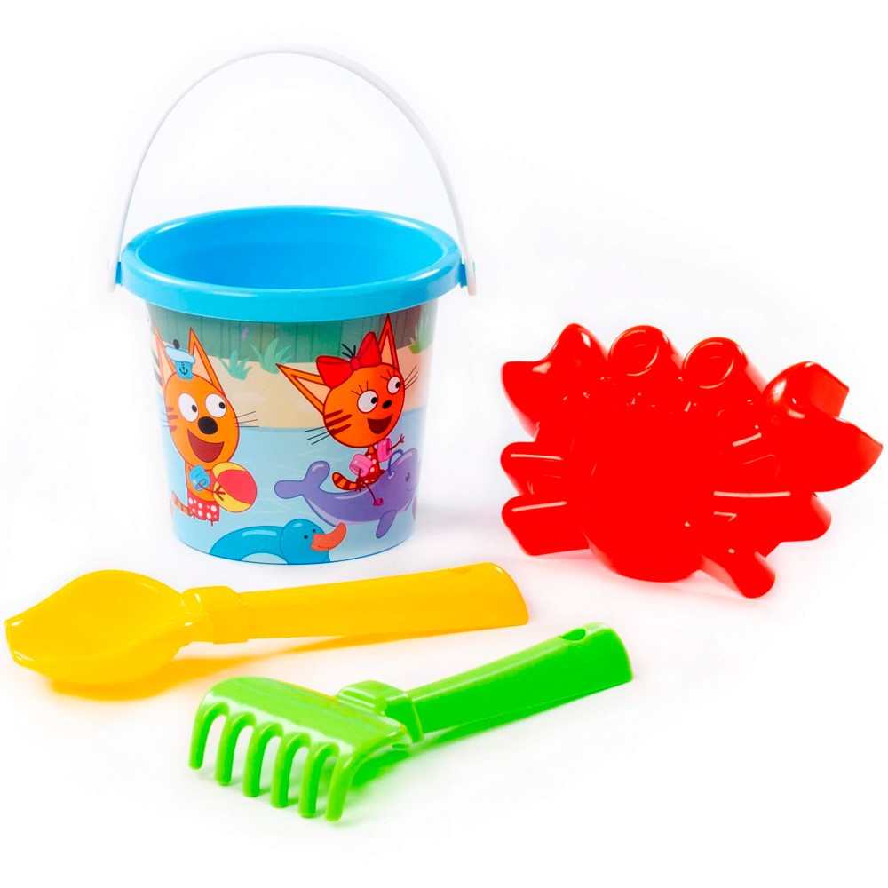 Песочный набор "Три кота" №8: Ведро малое с наклейкой, совок №2, грабельки №2, формочка краб №1 П-Е /18/