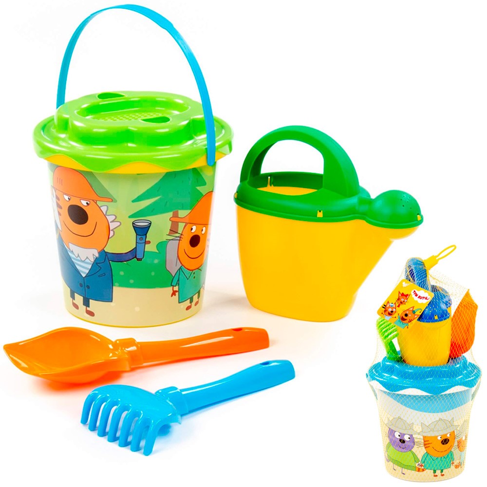 Песочный набор Три кота.Мир приключений №6:Ведро с наклейкой,ситечко Солнышко,лопатка №5,грабельки №5,лейка №10 91628