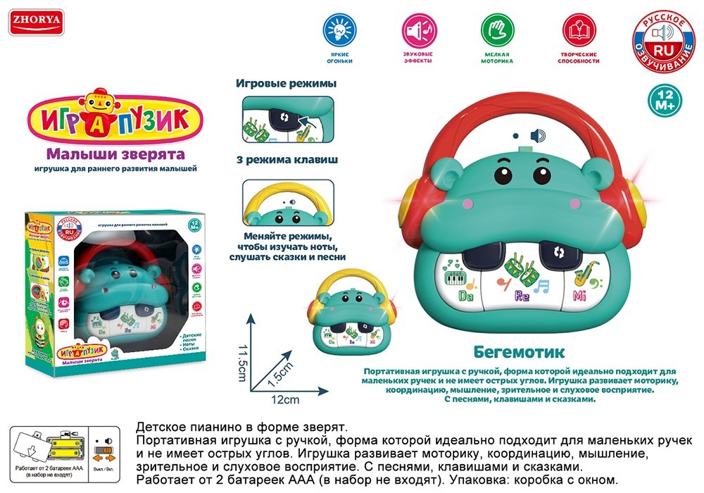 Пианино ZYA-A3317-3 Играпузик Бегемотик русск. озвуч. в кор.