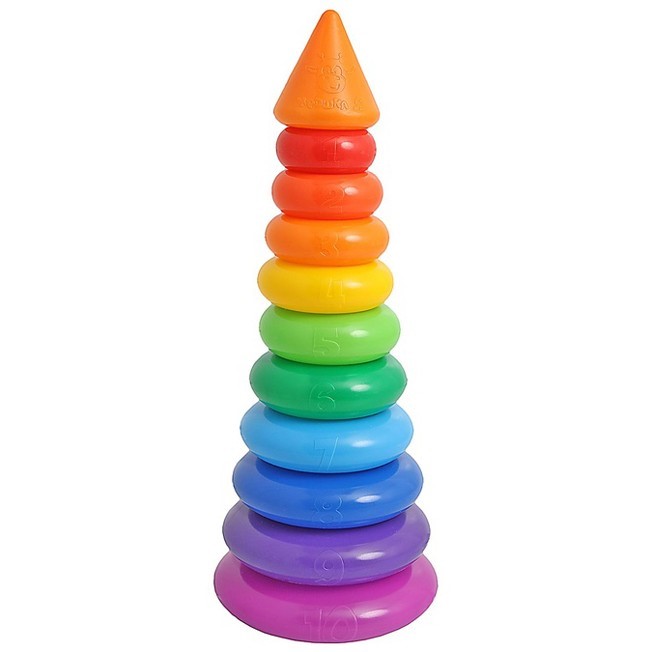Каждое кольцо разного цвета и пронумеровано. Собирая пирамидку, ребёнок освоит основные цвета радуги и получит базовые навыки счёта. Игры с красочной пирамидкой разовьют у крохи мелкую моторику, координацию движений, воображение, логическое и образное мышление, навыки конструирования. Он научится различать предметы по величине, сравнивать их и делать выводы. Также юный конструктор познакомится с такими понятиями, как «больше», «меньше», «круг», «конус», «плоский», «объёмный».