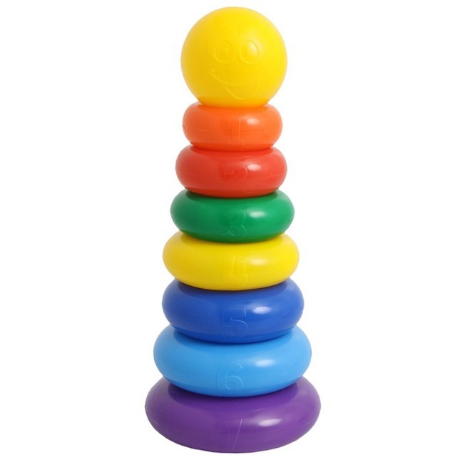 Пирамидка, 7 колец с шаром — одна из первых развивающих игрушек малыша, которая состоит из основы-стержня, круглых колец и наконечника в виде шара со смайликом.