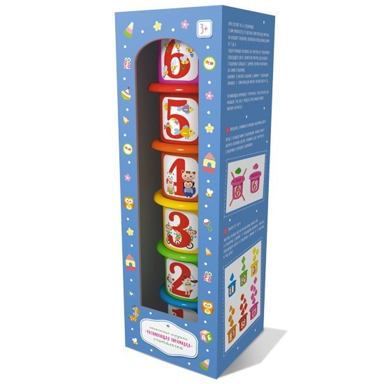 Для детей от 3 лет. Развивает логическое мышление, цветовое восприятие, мелкую моторику и координацию рук малыша и, как следствие, речевые навыки. Формирует элементарные представления о цвете, размере и форме. Учит счету до шести.