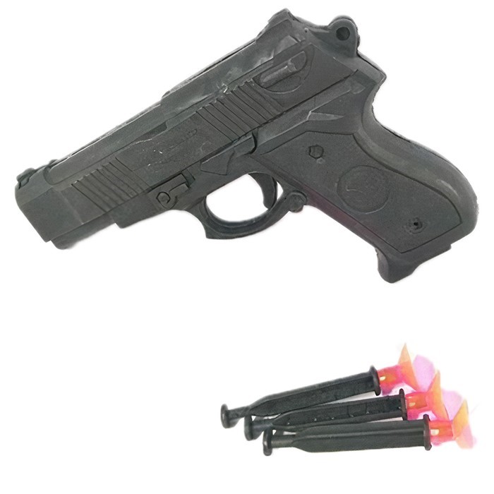 При нажатии на спусковой крючок стреляет софт-патронами на приссосках.