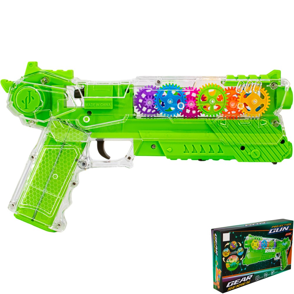 При нажатии на спусковой крючок внутри прозрачного корпуса вращаются цветные шестеренки.