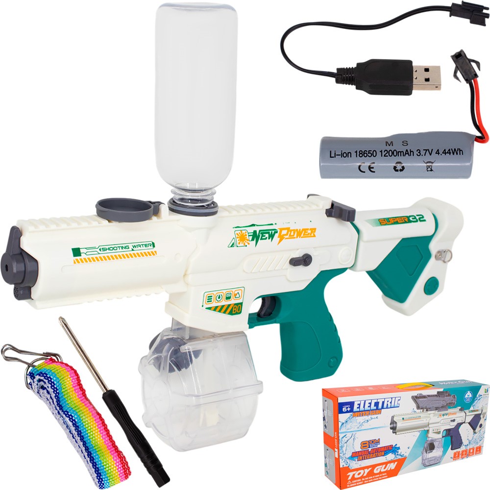 Принцип работы: вода поступает из ёмкости в дуло пистолета, стреляет при нажатии на кнопку.