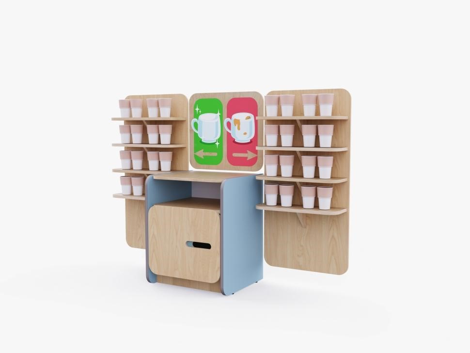 Набор для организации питьевого режима в детском саду: тумба для чайника, две навесные полки для кружек и табличка «Чистые и грязные кружки».