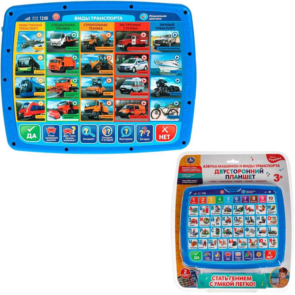 Развивающий двусторонний планшет станет прекрасным подарком для маленького любознайки. Такой планшет поможет ребёнку быстро и эффективно выучить азбуку, основы счёта и виды транспорта.