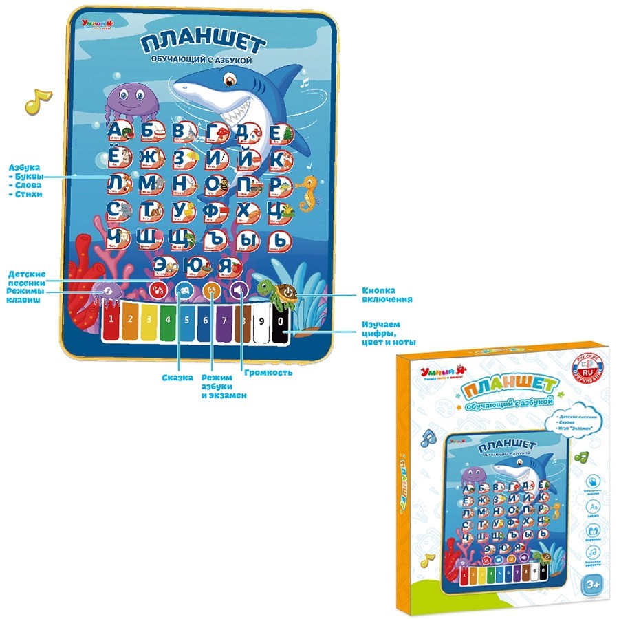 Он содержит веселые мелодии, обучающие функции, яркие картинки.