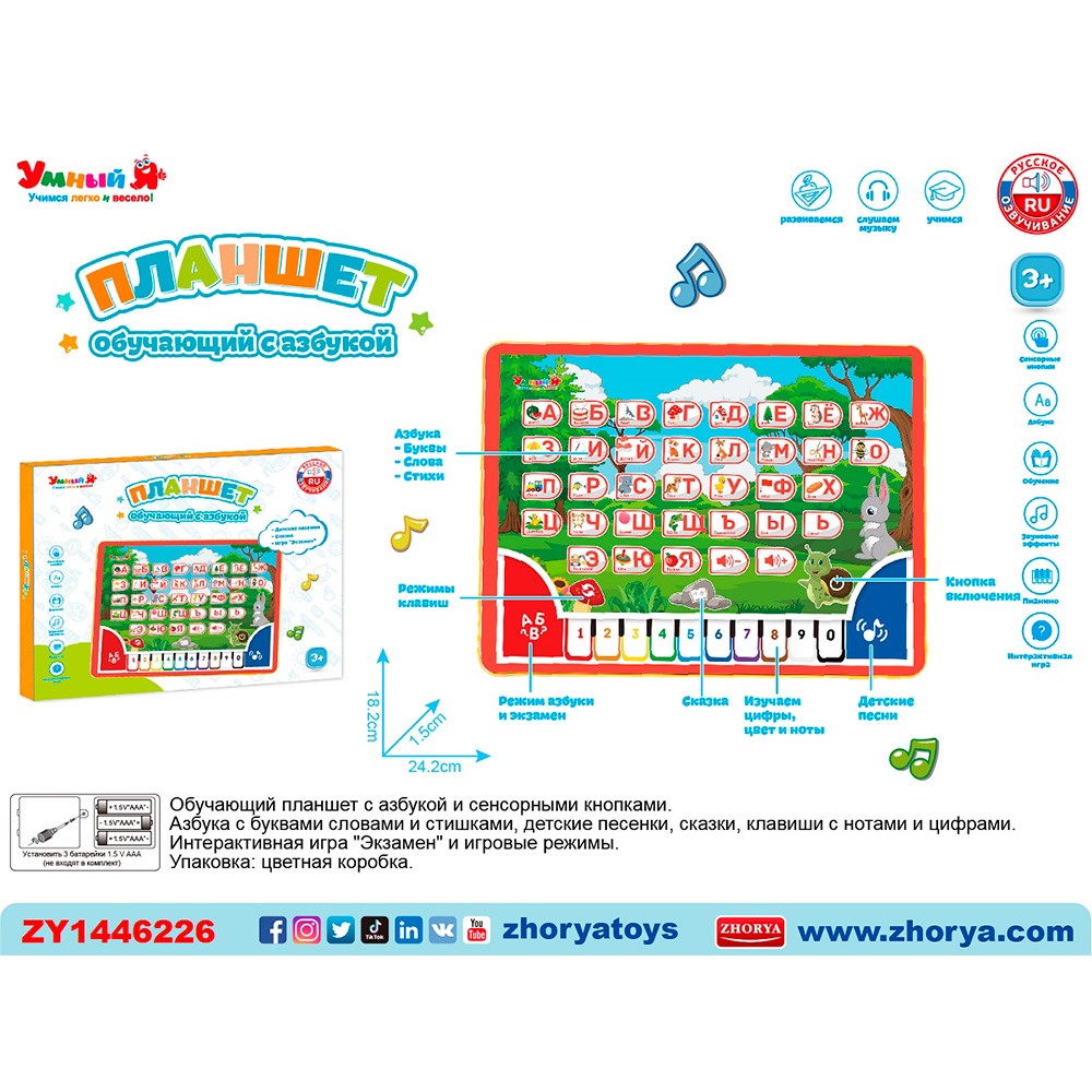 Он содержит веселые мелодии, обучающие функции, яркие картинки.