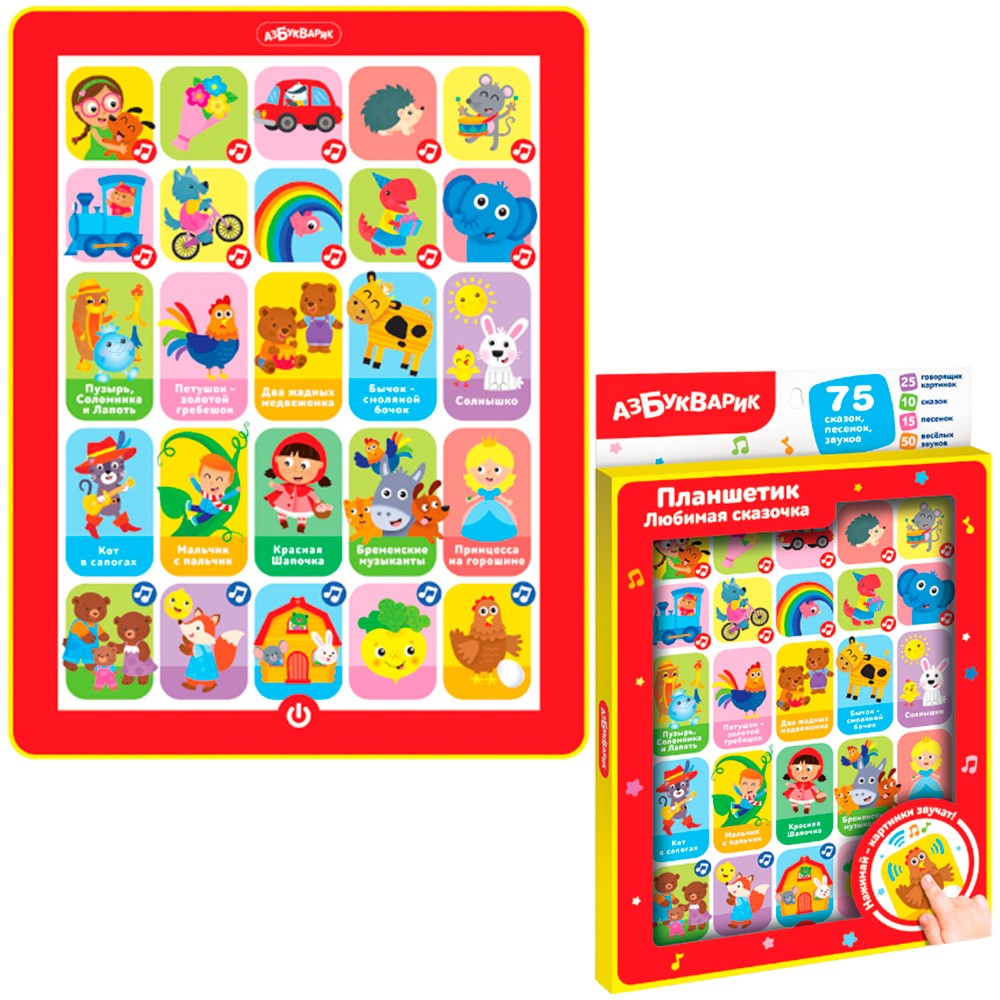 планшет воспроизводит сказки («Пузырь, Соломинка и Лапоть», «Петушок – золотой гребешок», «Два жадных медвежонка», «Бычок – смоляной бочок», «Солнышко»), и сказки известных писателей («Кот в сапогах», «Мальчик с пальчик», «Красная Шапочка», «Бременские музыканты», «Принцесса на горошине»), и весёлые детские песенки («Барбарики», «Мамочка», «Бибика», «Бум-Бум», «Чуку-чу» и др.), и даже сказки-песенки («Три медведя», «Колобок», «Теремок», «Репка», «Курочка Ряба»).