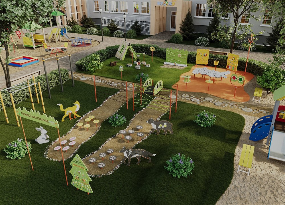1. Экоплощадка Жу-Жу: Входная группа "Привал на полянке"#nbsp;-#nbsp;cоздает яркий и запоминающийся образ площадки. Надпись на вывеске хорошо видна издалека и привлекает внимание.