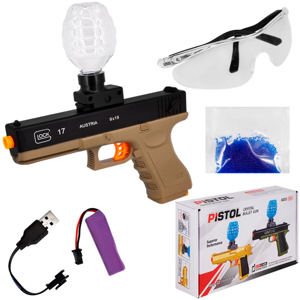 Комплектация: пистолет, пули, мишень, аккумулятор, кабель для зарядки