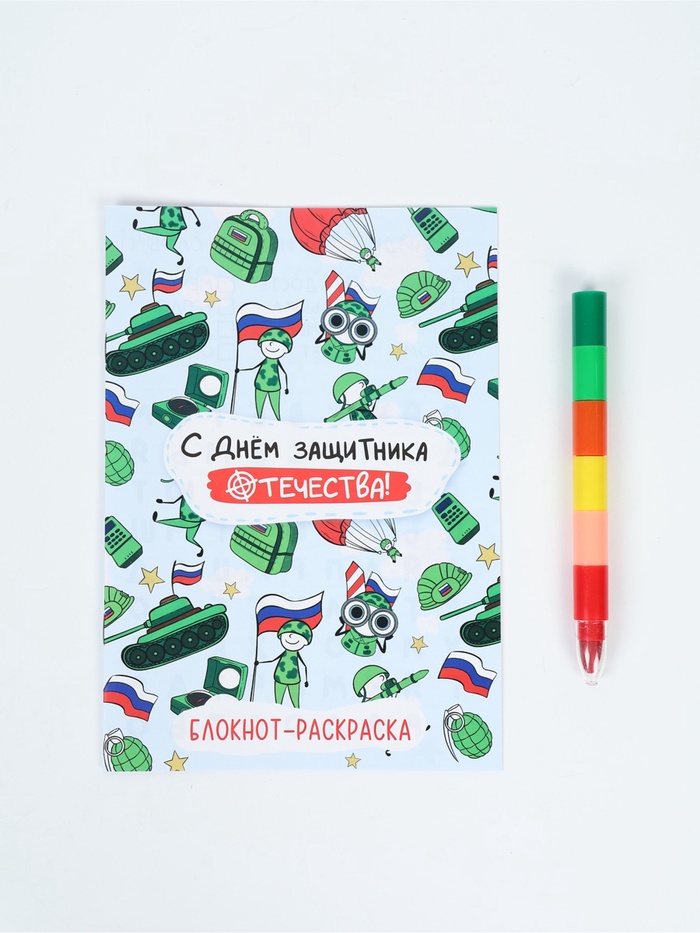 Подарочный набор «С днем защитника отечества», блокнот-раскраска А5, 8 страниц и восковой карандаш