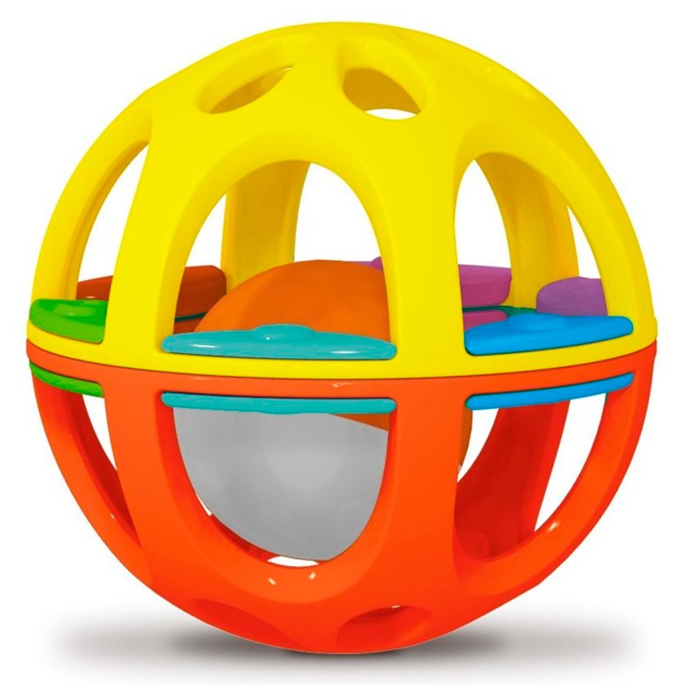 Погремушка в виде мягкой сферы с фигурными отверстиями. Внутри этой сферы находится шарик. При перекатывании или потряхивании игрушка издаёт приятные звуки.