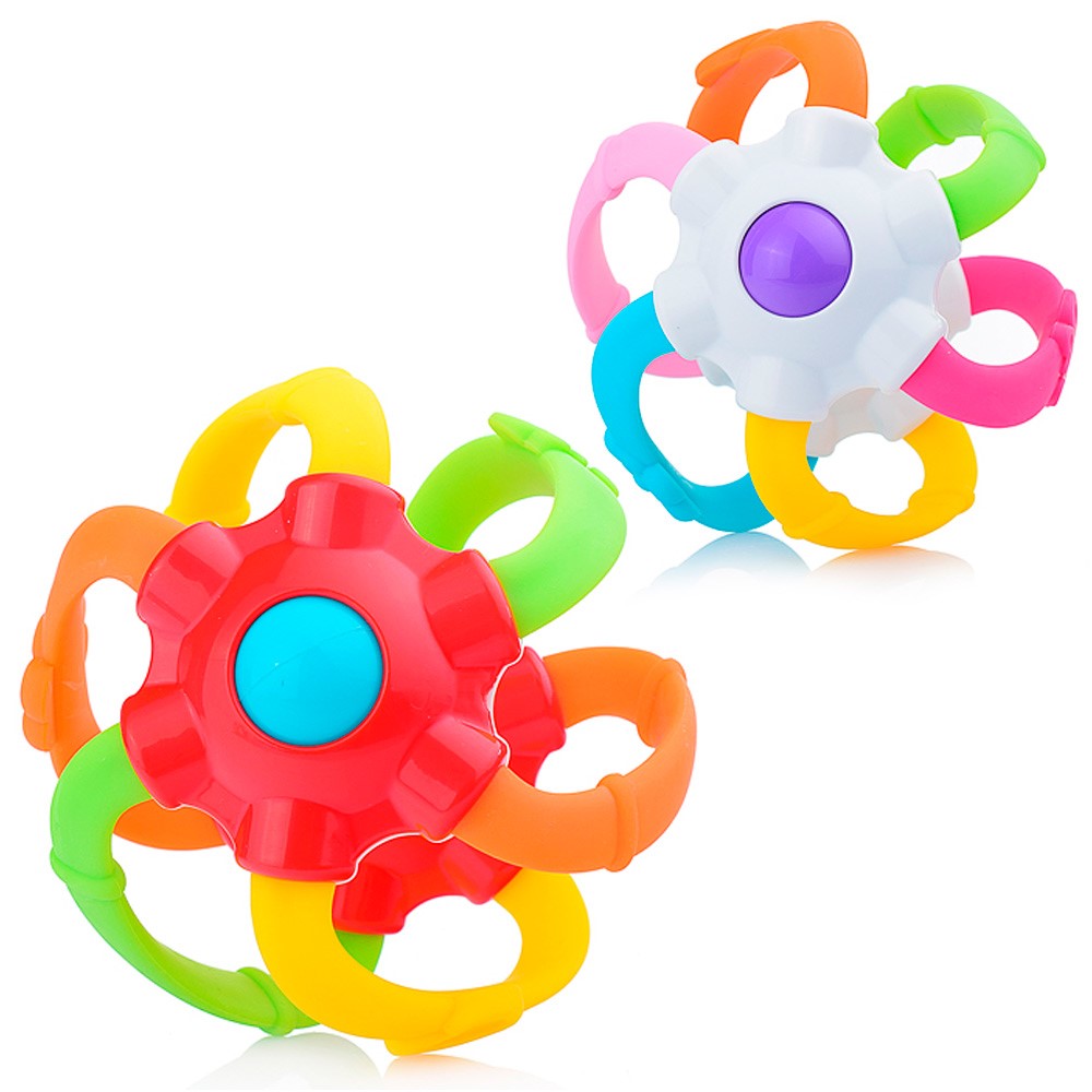 В верхней и нижней части погремушки находятся цветные шарики, которые можно увлечённо крутить в разные стороны. По бокам игрушки расположены мягкие прорезыватели с фигурными элементами, которые малыш наверняка оценит во время прорезывания зубов.