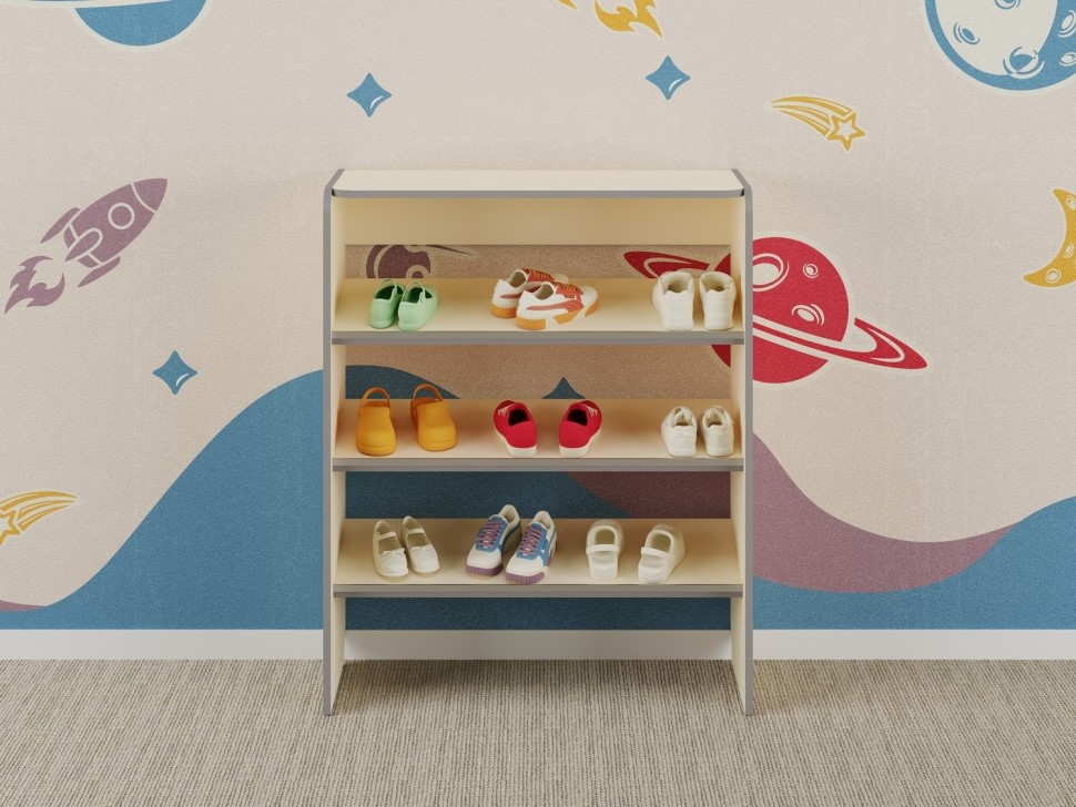 Система хранения детской уличной обуви удобна и практична: наклонные полки обеспечивают легкий доступ и хорошую видимость, а бортики предотвращают падение обуви. Высота секций оптимальна для хранения различных типов детской обуви — от легких сандалий до с