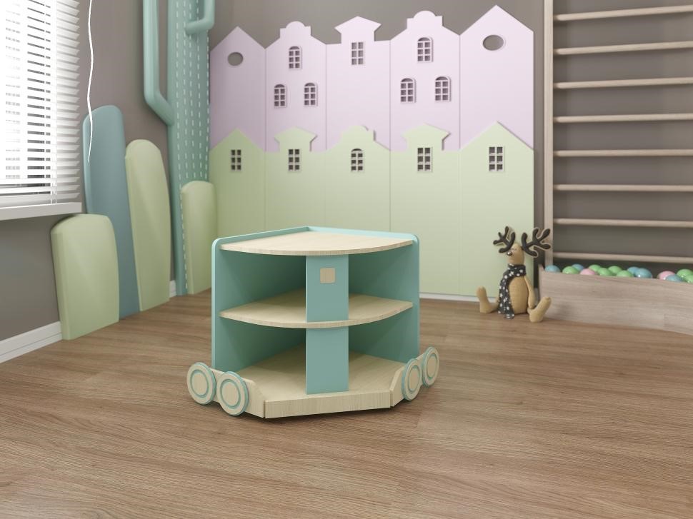 Угловой вагон. Самый маленький вагон — это две открытые радиусные полки, которые могут разворачиваться влево и вправо. Он подходит для завершения состава или для образования угла. На верхней крышке малыши могут сидеть, а на нижние полки составлять игрушки или тематическое наполнение.