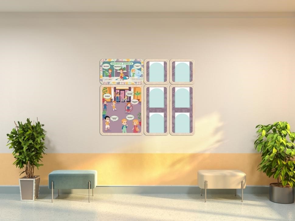 Информационный стенд для оформления стен в детских садах, начальной школе и организациях дополнительного образования. Красочные наглядные иллюстрации с простыми подписями помогут дошколятам понять правила этикета, даже если они ещё не умеют читать. Важная информация для родителей может размещаться в акриловых карманах около каждого стенда.