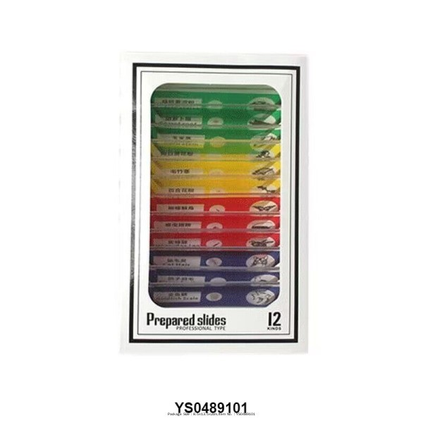 В комплект входят 12 предметных стекол для микроскопа, которые содержат разные частицы:
