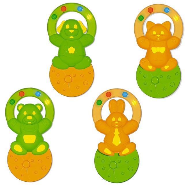 Малышам часто надоедают обычные прорезыватели. Но если его превратить в погремушку, то такая игрушка станет надолго любимой для младенца. Данный прорезыватель дополнен забавной фигуркой животного и прозрачным кольцом с шариками. Малышу понравится наблюдать за их движением и слушать их звук.