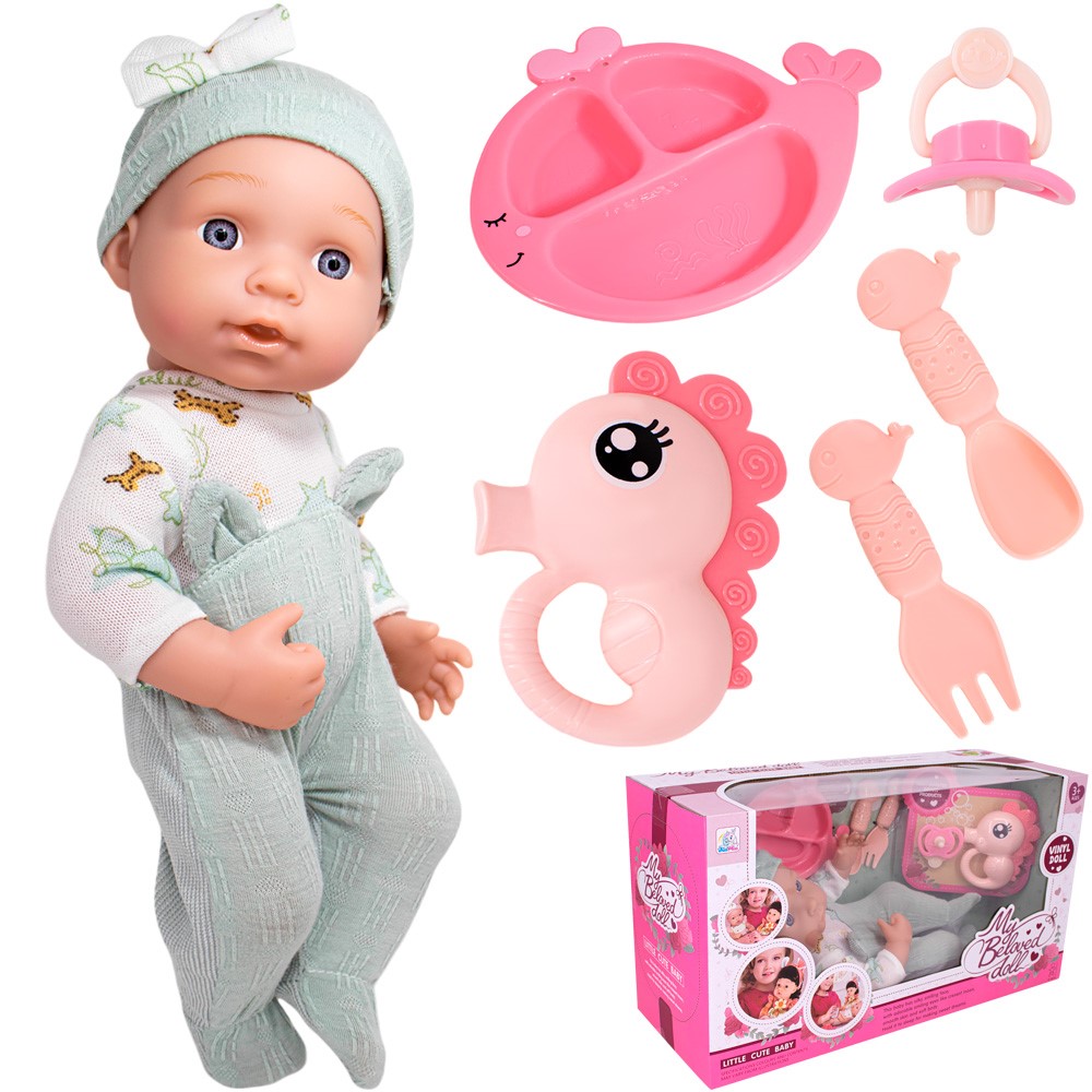 Комплектация: пупс - 1 шт, соска - 1 шт, тарелка - 1 шт, вилка - 1 шт, ложка - 1 шт, игрушка - 1 шт.