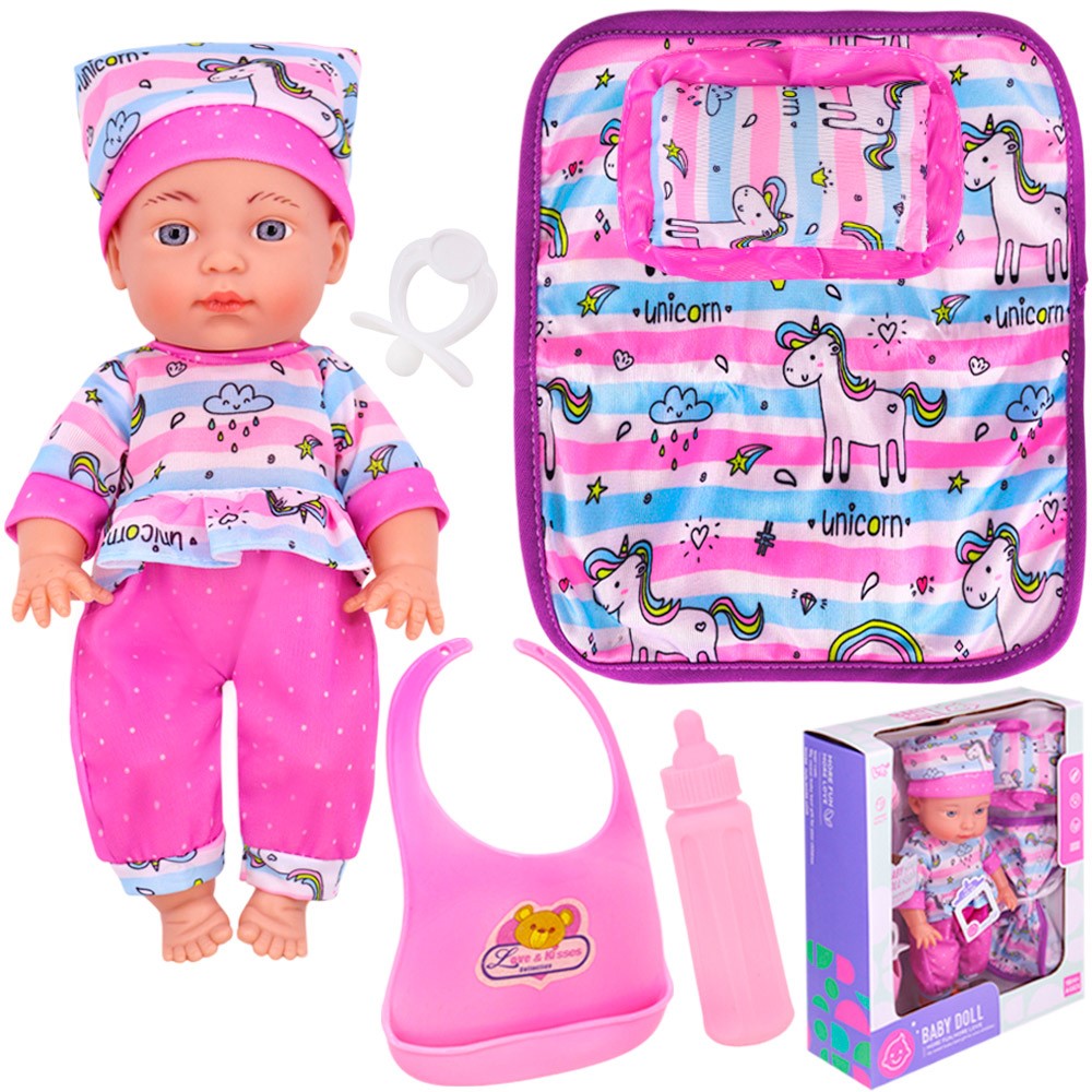 Комплектация: кукла - 1 шт, подушка - 1 шт, одеяло - 1 шт, бутылочка - 1 шт, нагрудник - 1 шт, соска - 1 шт.