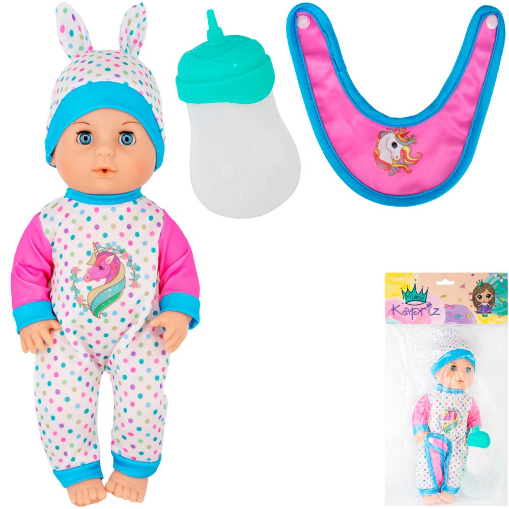 Комплектация: пупс - 1 шт, соска-пустышка – 1 шт, бутылочка – 1 шт, нагрудник – 1 шт,