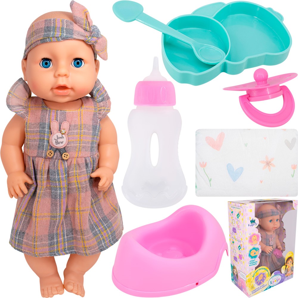 Комплектация: кукла - 1 шт, тарелка - 1 шт, ложка - 1 шт, подгузник - 1 шт, бутылочка - 1 шт, горшок - 1 шт, соска - 1 шт.