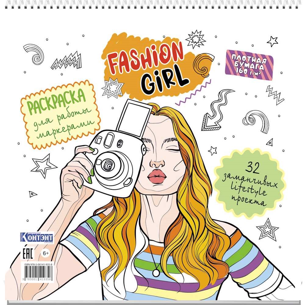 Раскраска Fashion Girl для работы маркерами белая обложка, девушка с фотоаппаратом 9785001419358