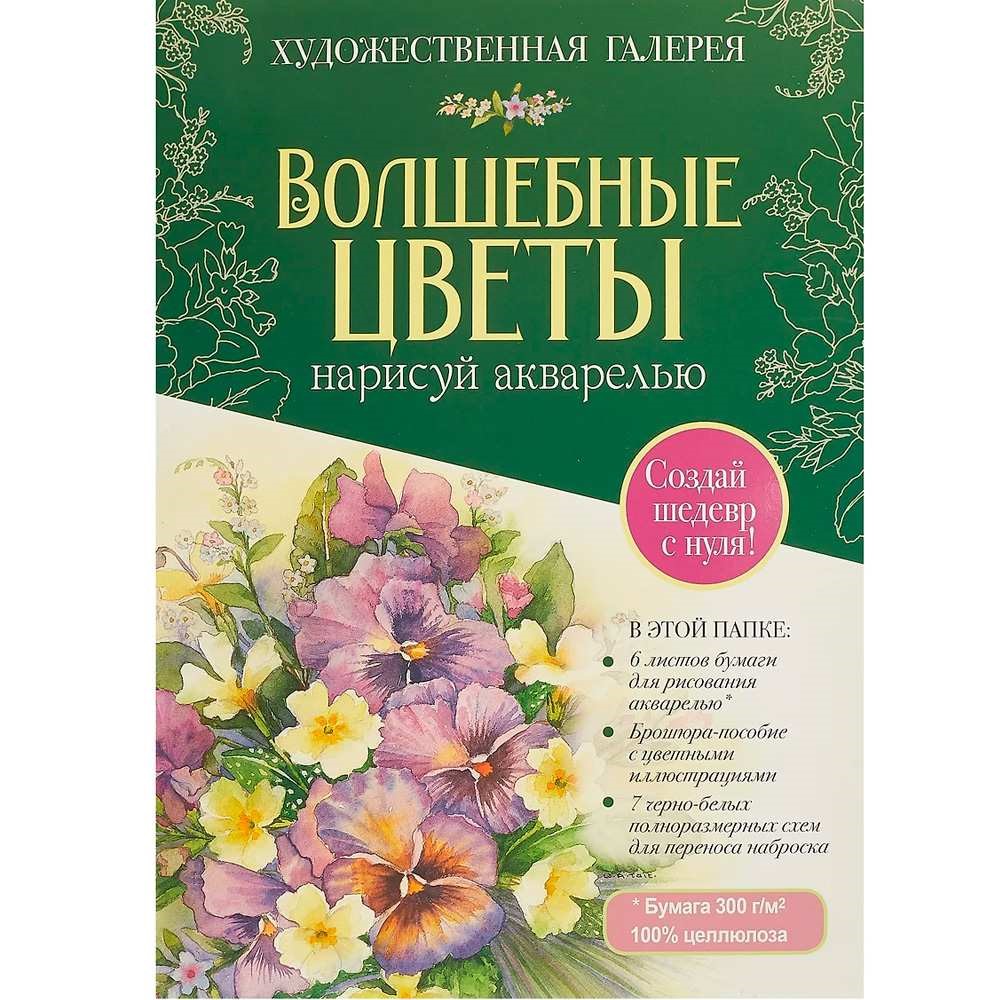 Раскраска Папка с акварельной бумагой «Волшебные цветы. Нарисуй акварелью» + Брошюра-инструкция (зелёный набор) ISBN 978-5-00241-157-3