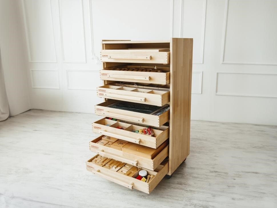 ➤ Система хранения продумана до мелочей. Стеллаж имеет 7 ящиков-органайзеров и поворотные колёса, что позволяет легко передвигать стеллаж по комнате. У всех развивающих элементов есть своё определённое место в ящиках-органайзерах.