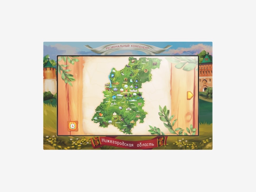 Программное обеспечение включает интерактивную карту нижегородской области, викторину, пазлы, игры «Найди пару» и «Найди отличия».