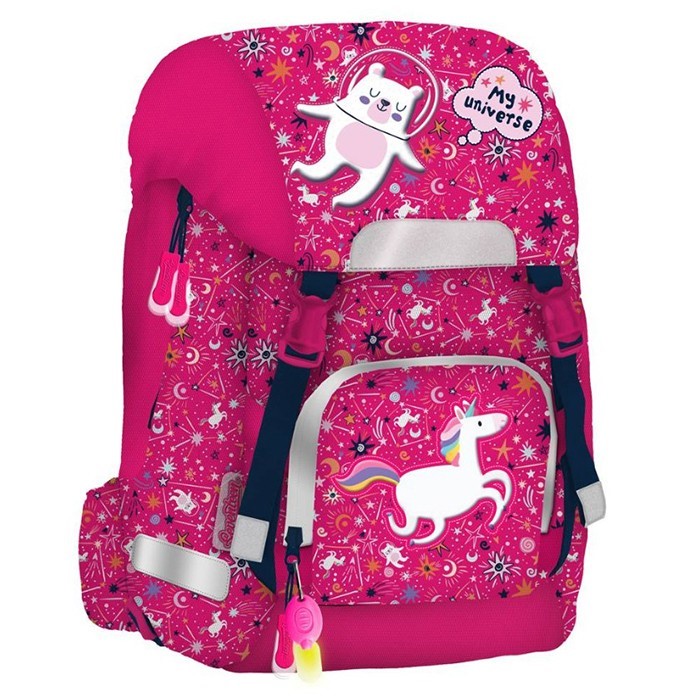 Детский ранец от «Seventeen» облегченной конструкции с эргономической мягкой спинкой, имеет одно большое отделение, которое закрывается крышкой-клапаном, по бокам расположены вместительные карманы на светоотражающими молниями; дно прочное пластиковое, лямки регулируются по длине и обтянуты воздухообменной сеткой. Отличный ранец для школьника!
