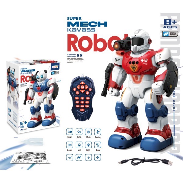 Комплектация: робот - 1 шт, пульт управления - 1 шт, пули - 3 шт, кабель для зарядки - 1 шт, оружие, щит, инструкция, бутылочка