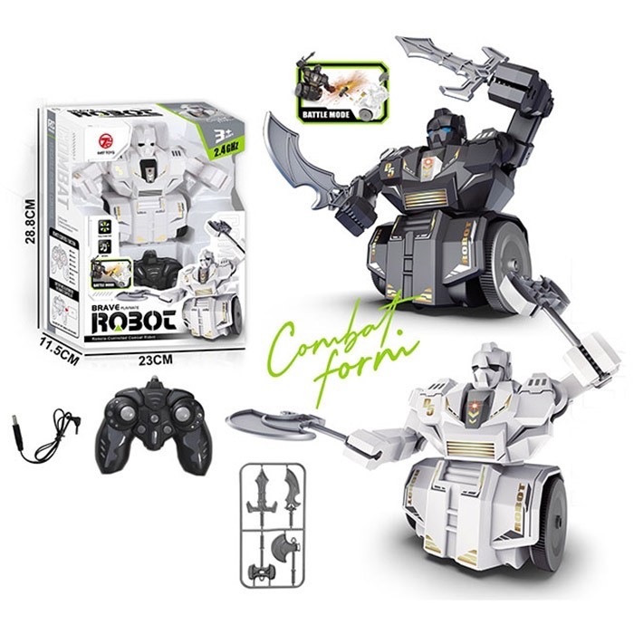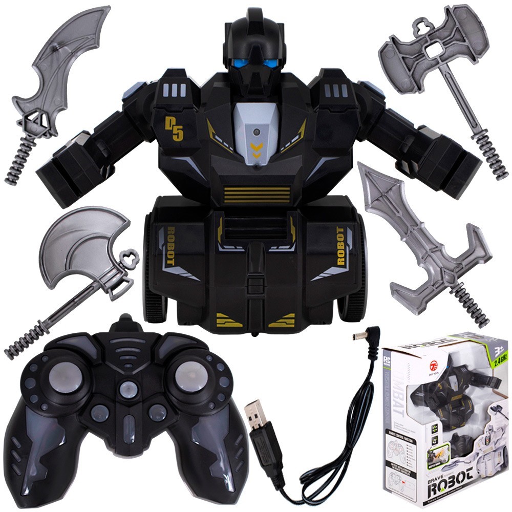 Комплектация: робот - 1 шт, пульт ДУ - 1 шт, инструкция, оружие - 4 шт, кабель для зарядки