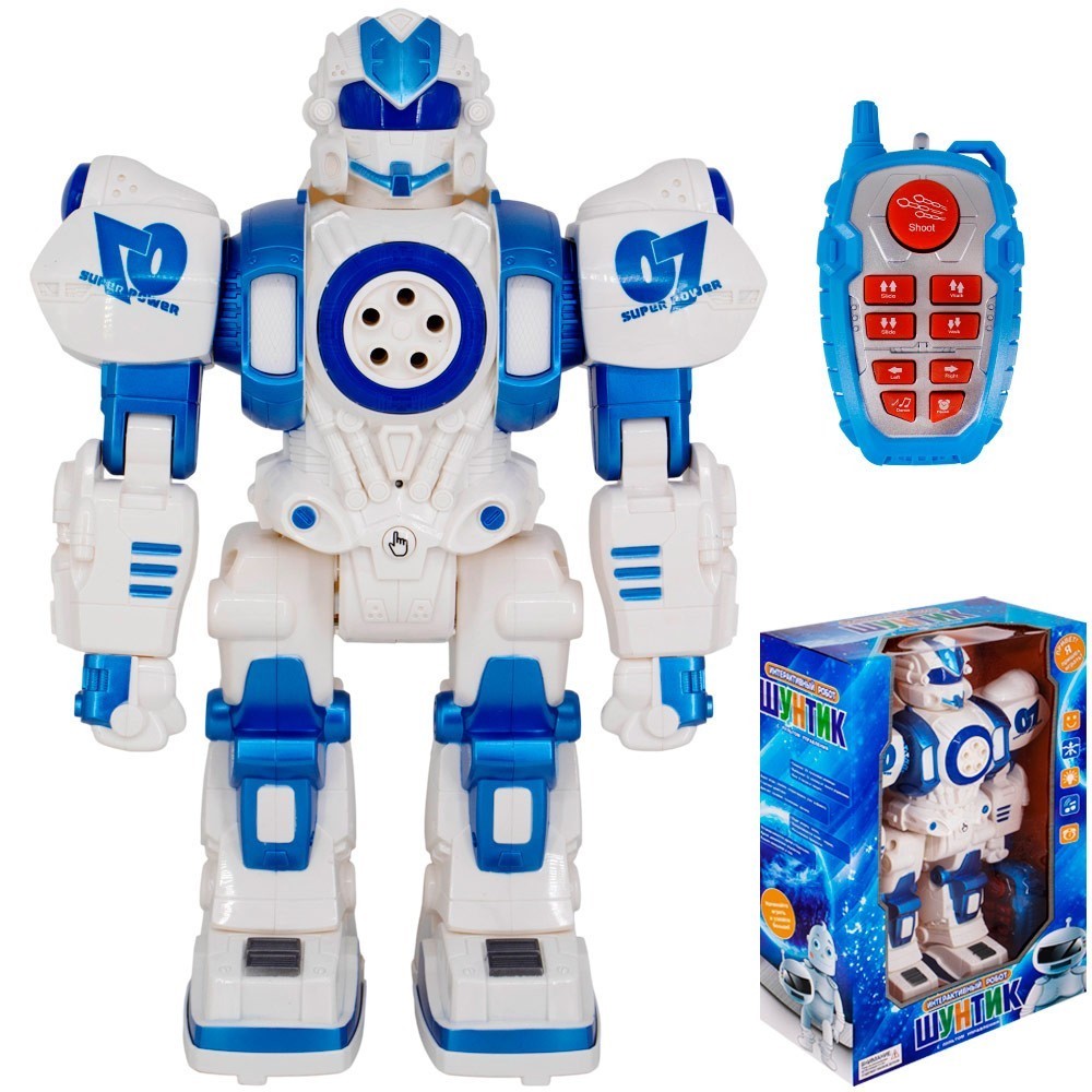 Игровой робот ШУНТИК на радиоуправлении, поет песни, танцует, знает сказки, игры, скороговорки, учит алфавиту, стреляет ракетами. Двигает головой, туловищем, руками, ходит вперед, назад, поворачивается направо-налево. Можно утановить время и будильник. Яркая динамичная подсветка