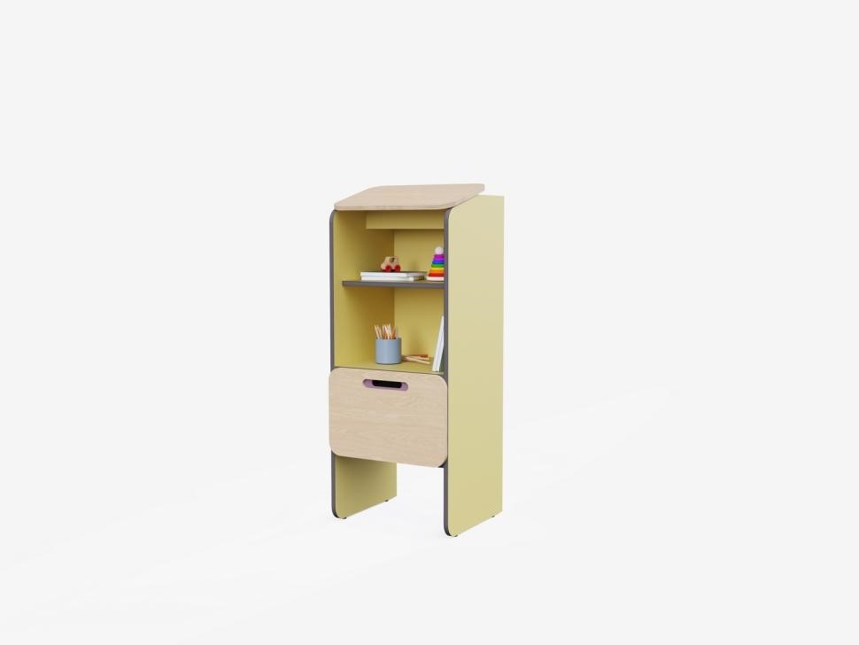 Шкаф-конторка для записей с наклонной верхней столешницей служит для ведения журналов приёма и передачи детей, а также заполнения необходимых документов. Конструкция эргономична для анатомии взрослого человека, и воспитателю будет удобно делать записи. Предмет из коллекции мебели «НЕГА».