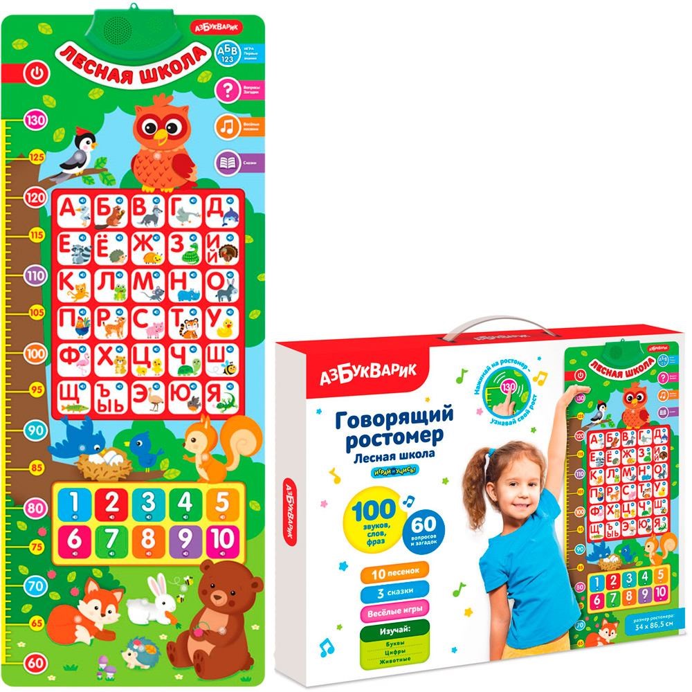 Обучающий плакат-ростомер поможет и рост измерить, и выучить буквы с цифрами! Нажимай на картинки – играй и учись, слушай любимые потешки и народные сказки («Заюшкина избушка», «Три медведя», «Лисичка-сестричка и серый волк»). А ещё ты сможешь поиграть в увлекательные игры: «Первые знания», «Угадайка», «Загадки».