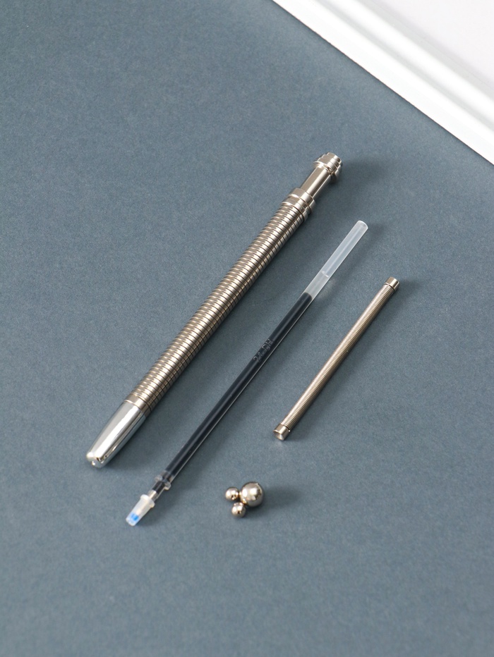 Эта стильная металлическая ручка — больше чем инструмент для письма. Её гибкий корпус создан для того, чтобы снимать напряжение в течение дня. Просто согните её в руках, чтобы сосредоточиться и вернуть спокойствие. Магнитный механизм обеспечивает надёжное крепление колпачка и приятный тактильный клик, превращая каждое использование в небольшой ритуал. Чёрные чернила ложатся чётко и аккуратно, а серебристый дизайн добавляет образу солидности.