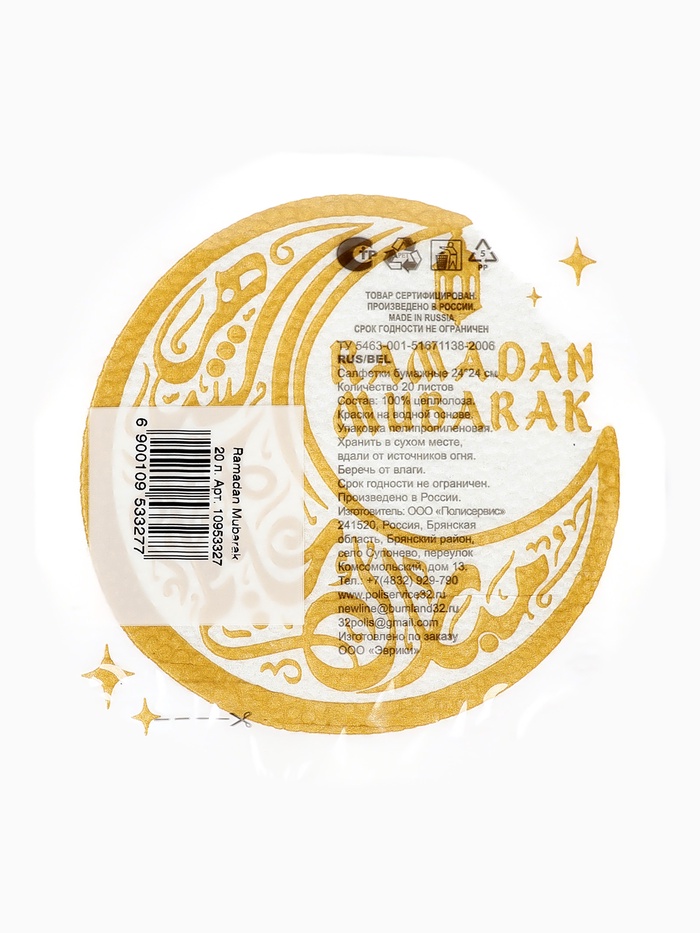 Салфетки бумажные однослойные «Ramadan Mubarak», белые с золотом, 24?24 см, 20 шт. (комплект 2 шт)