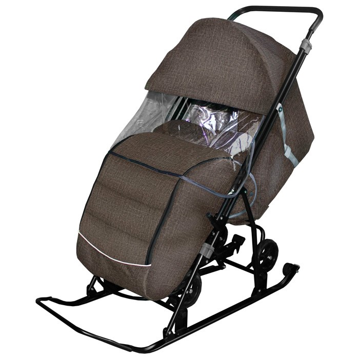 Санки коляска Снежинка Универсал 1 Лен серо-коричневый чехол д/ног, колесо,тент,перекидная ручка