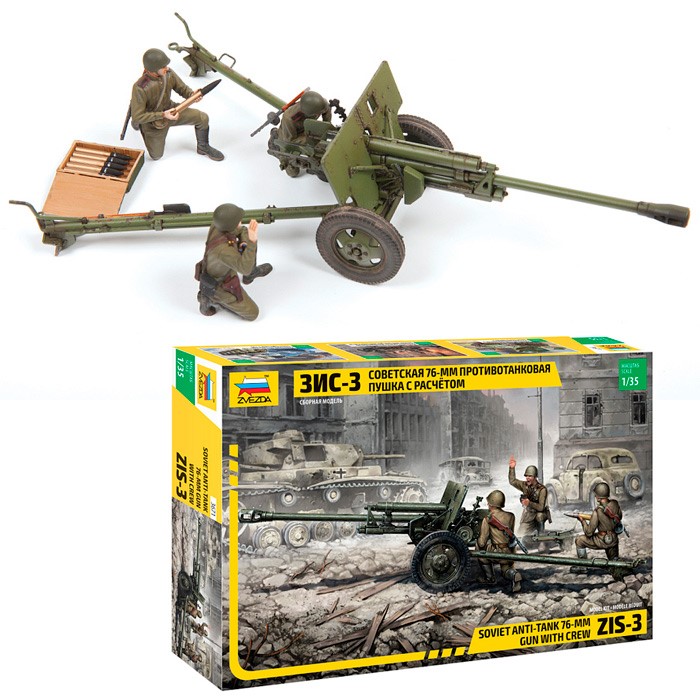 Сборная модель Советская 76-мм противотанковая пушка ЗиС-3 с расчетом - новая разработка от производителя "Звезда". Модель собирается при помощи специального клея, элементы не окрашены. Клей и краски в набор не входят.