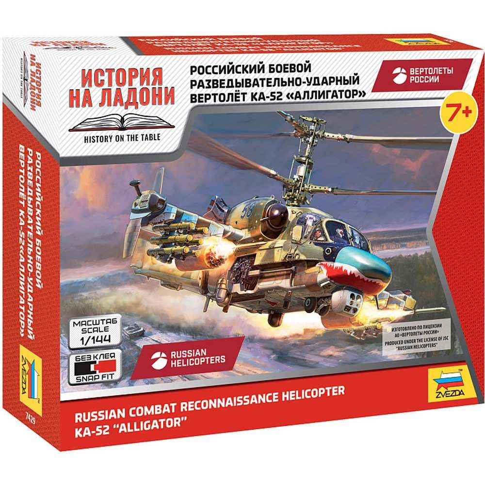 Набор конструктора от торговой марки Zvezda — это комплект для сборки уменьшенной копии российского двухместного разведывательно-ударного вертолёта Ка-52 «Аллигатор».