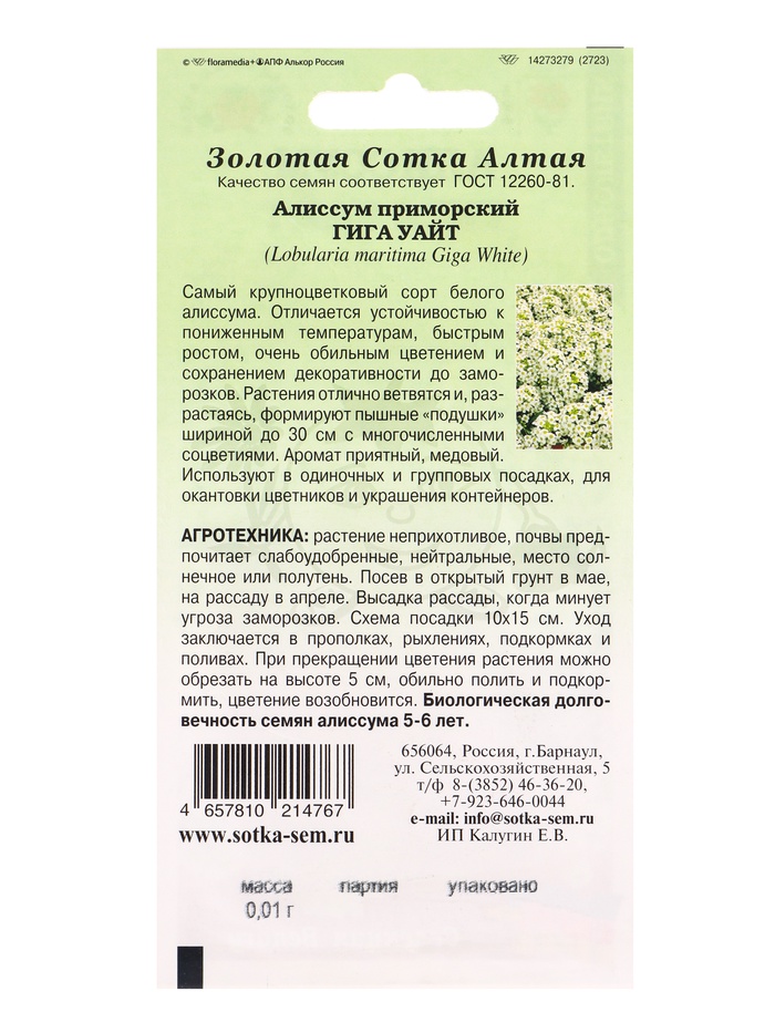 Семена Алиссум Гига Уайт /Сотка/ 0,01 г/*1800 (комплект 2 шт)