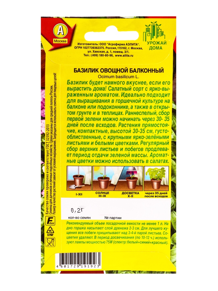 Семена Базилик овощной Балконный Урожай дома, Ц/П,0,2 г (комплект 3 шт)