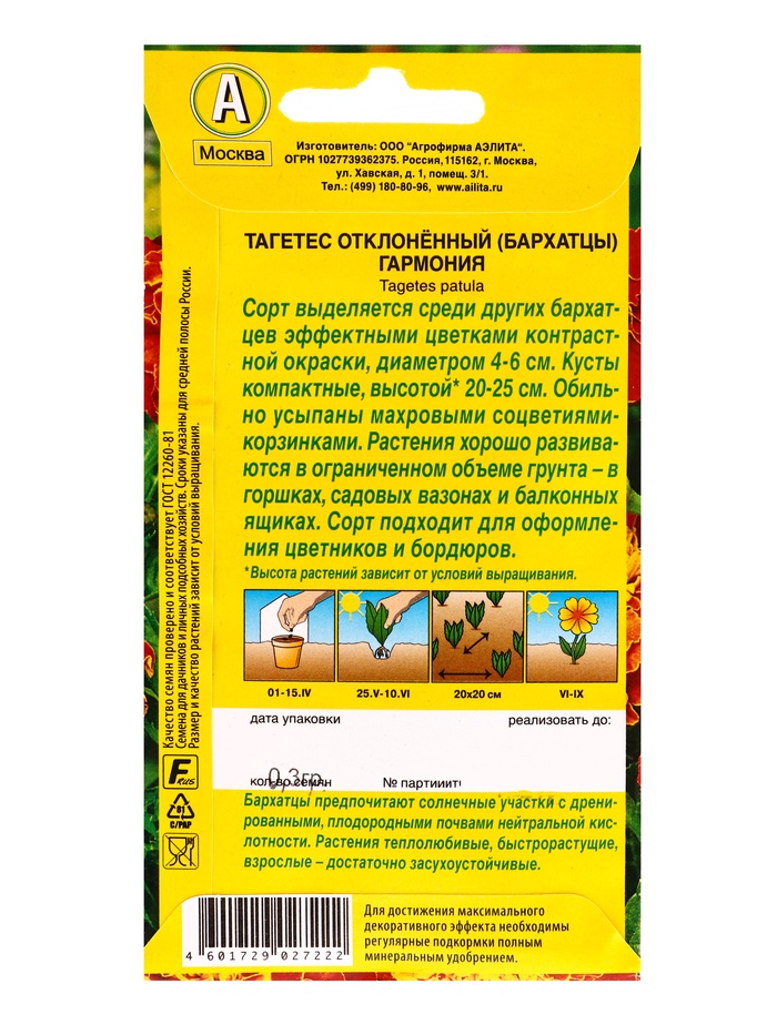 Семена цветов Бархатцы Гармония отклоненные , Ц/П,0,3 г