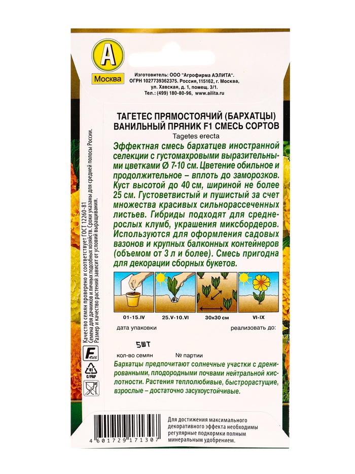 Семена цветов Бархатцы Ванильный пряник F1, смесь сортов Золотая серия, Ц/П,5 шт.